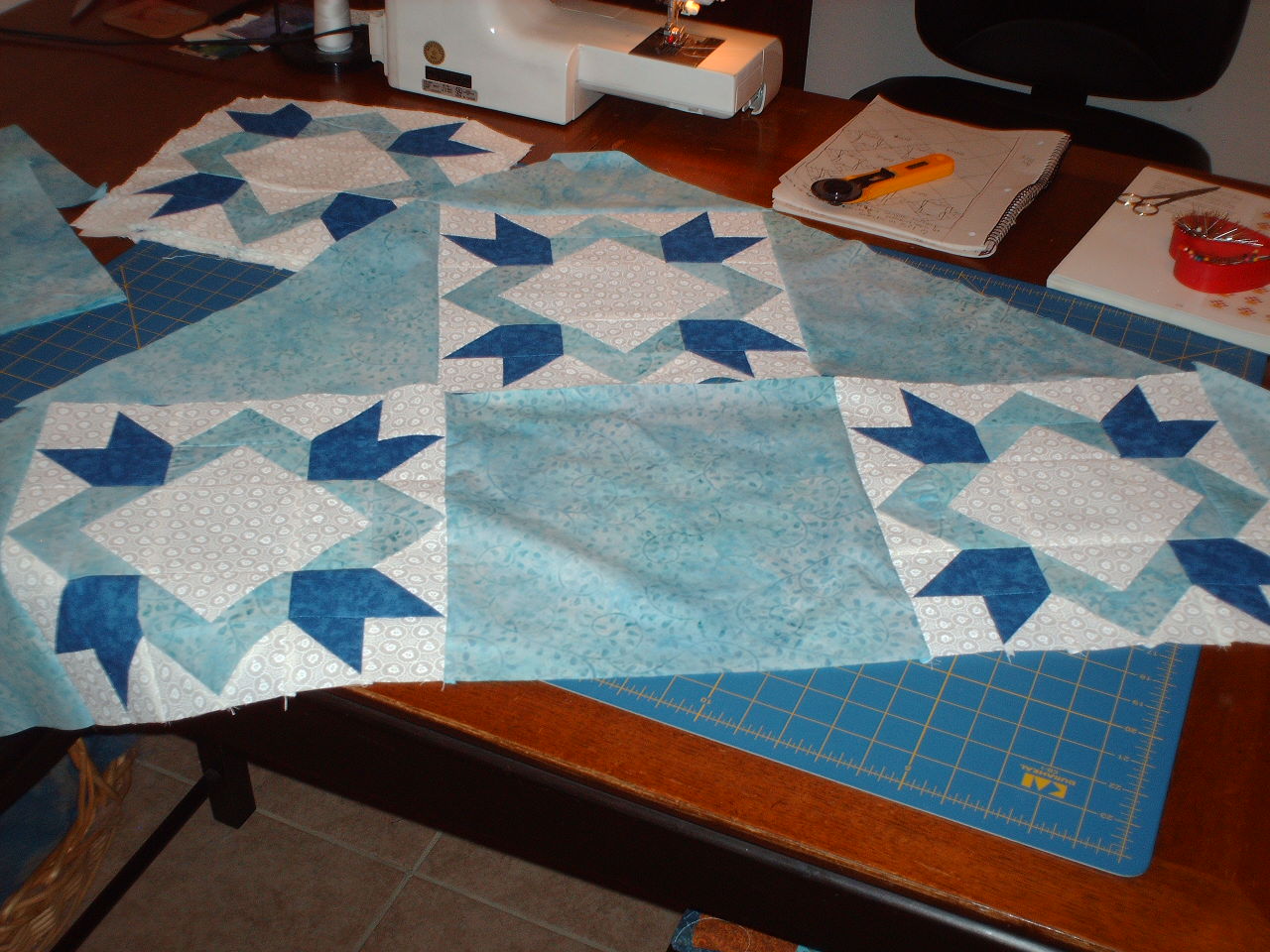 The blue laurel wreath blocks are done. There are only 12, but each block has 49 pieces! Started assembling the quilt top and it is pretty. Also, finished 13 blocks of the second quilt. Put it aside for the moment while I finish the blue quilt.